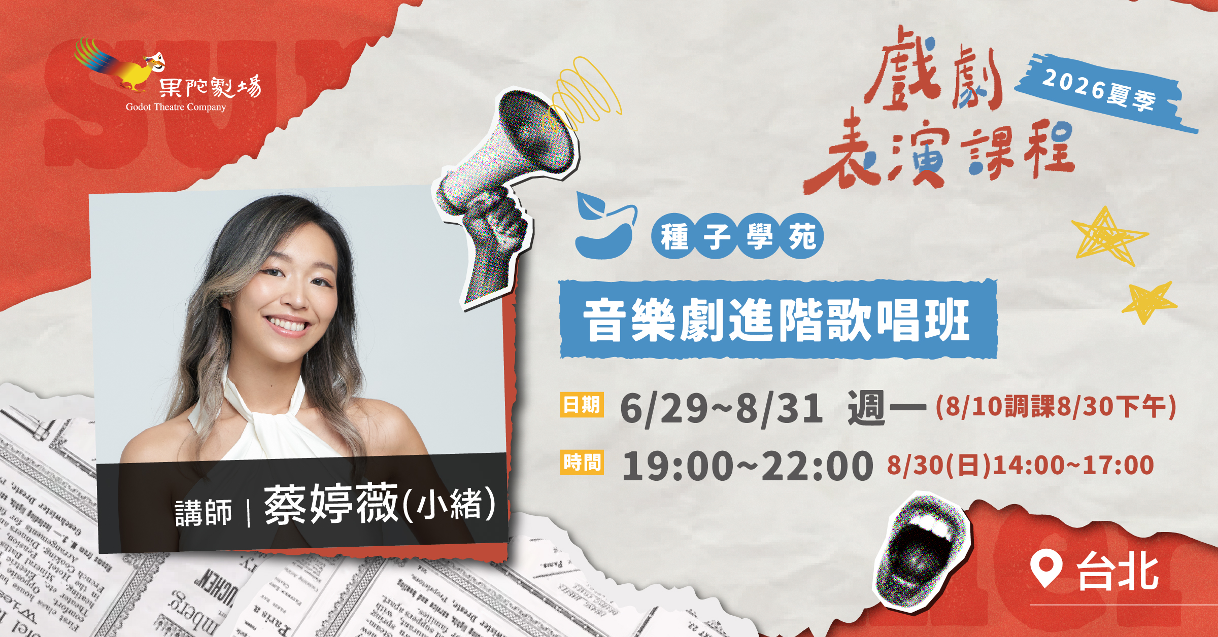 對象:16~60歲,有曾學過歌唱課30小時以上,或參加過果陀歌唱基礎班的學生或社會人士(非果陀舊生請於備註註明經歷)
